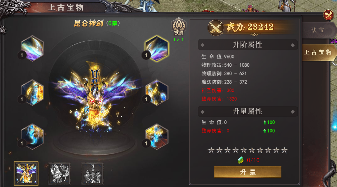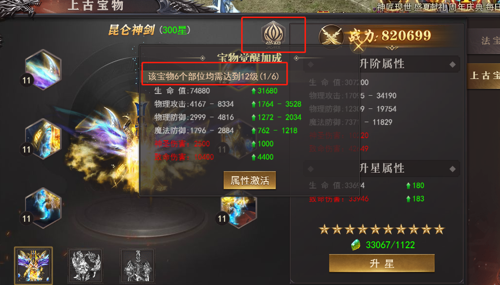 2. 升星到一定星级后,需要宝物觉醒到一定阶数,才能继续升星;
