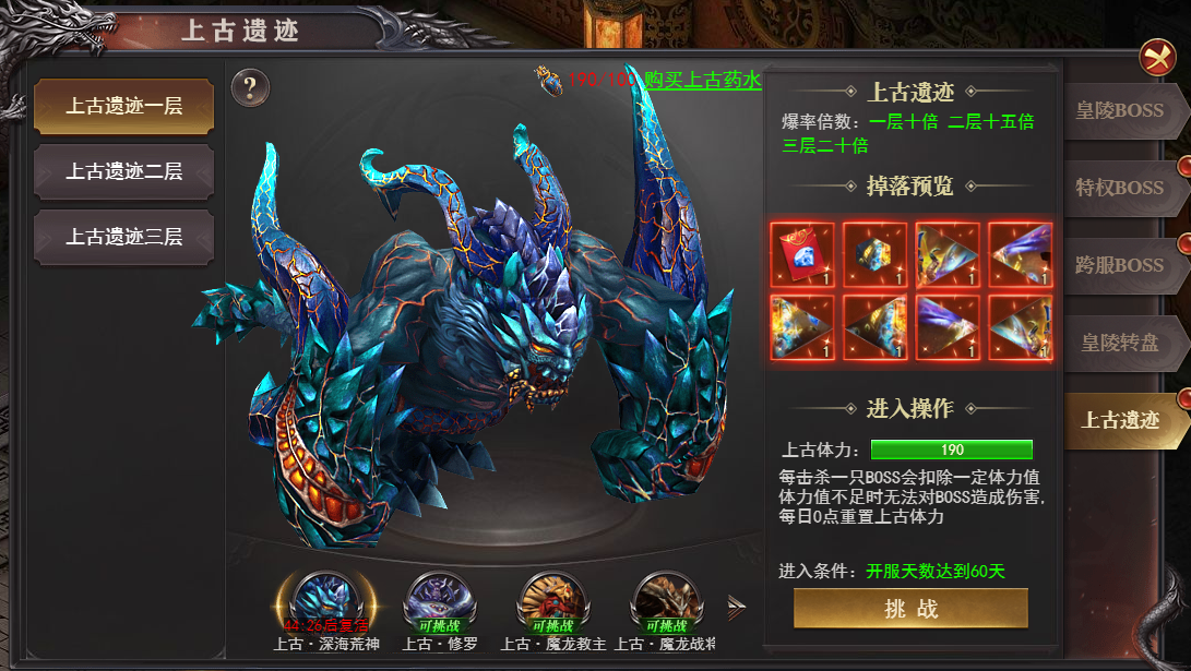 3. 上古体力初始100点,每日0点重置,可花费钻石购买上古药水,每日可购买两瓶,购买体力保留,但超过100点不恢复,低于100点,每日0点重置;