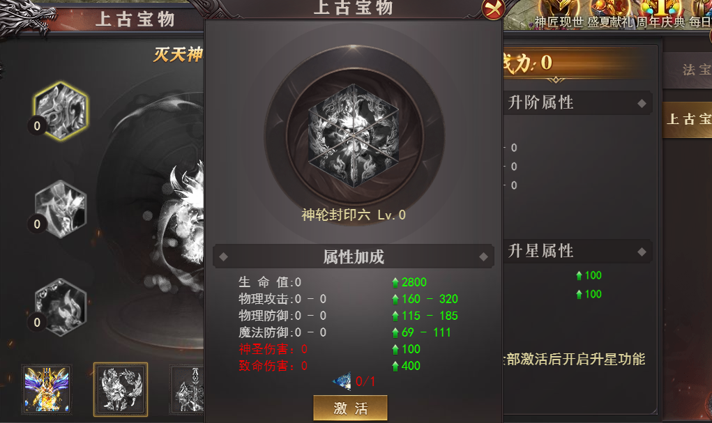 注意:上古宝物分为六个部件,每个部件均被封印,需要凑齐1-6封印才能激活宝物。
