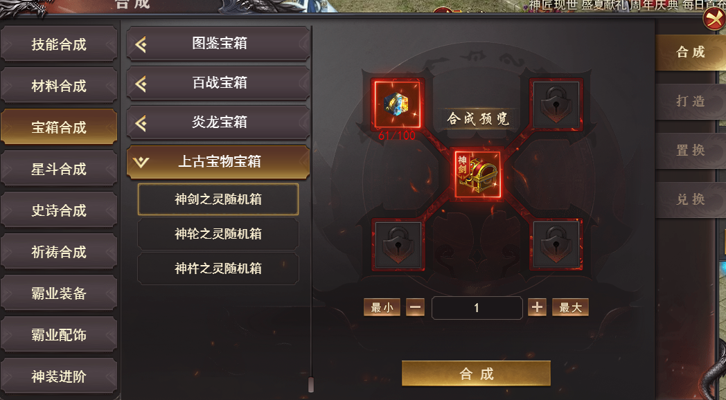 神剑之灵随机箱:需要神剑之灵*100,合成随机箱子,随机开出神剑碎片1-6其中之一;