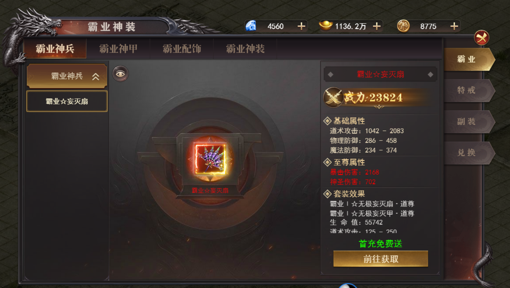 神兵战甲系统开启后玩家穿戴霸业套装,不仅可以获得炫酷的外观表现,还能大幅提升角色PK和杀怪能力
