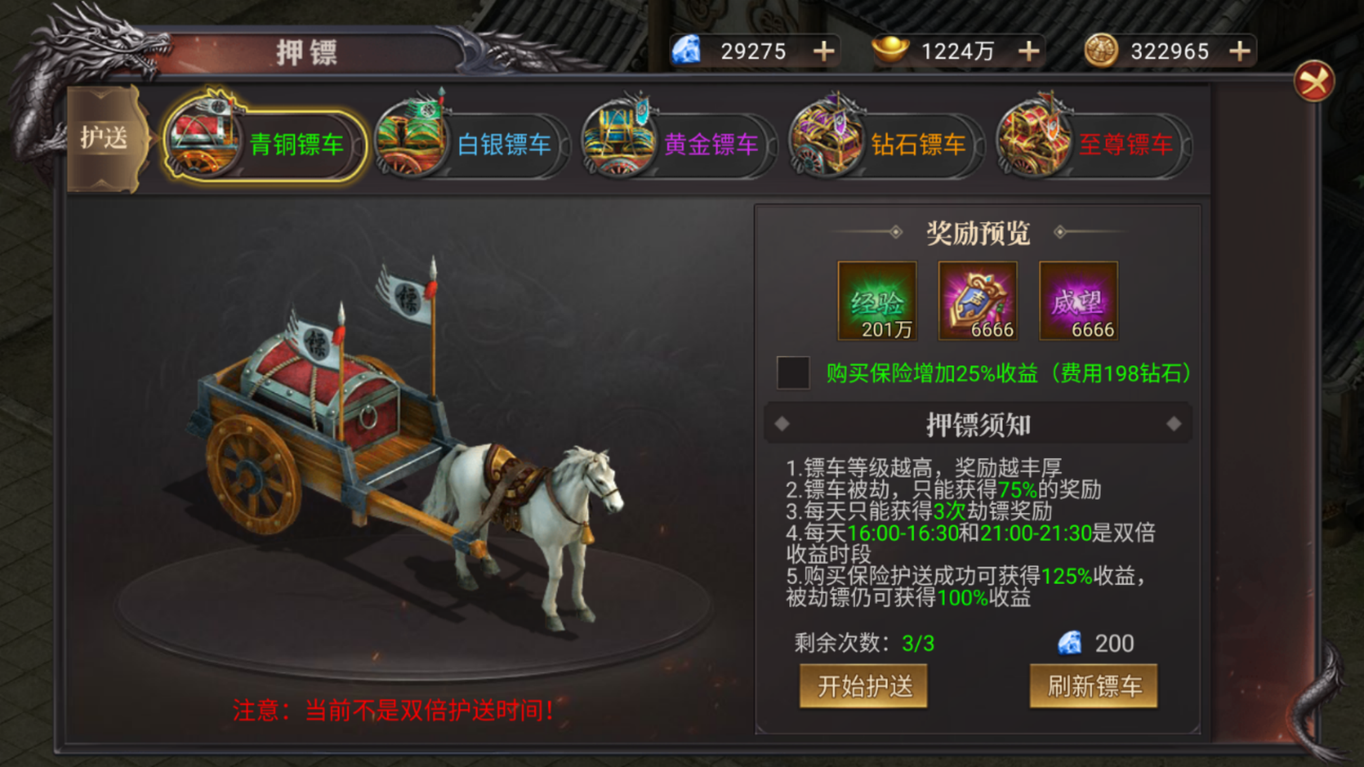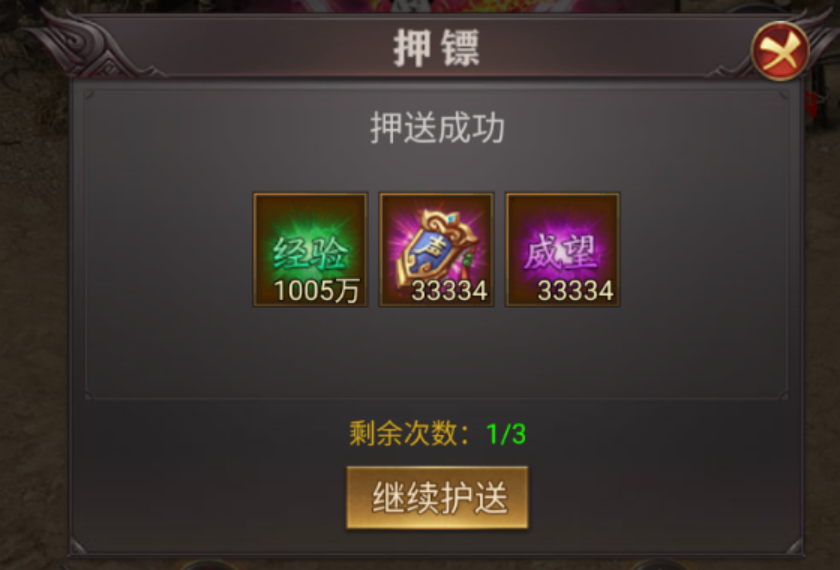 5. 购买保险,单次押镖没有被劫镖,则单次可获得125%的押镖奖励。
