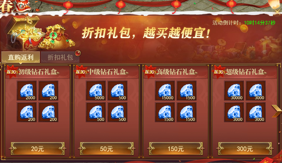 活动期间钻石等各种道具,超高返利、超低折扣,越买越便宜!