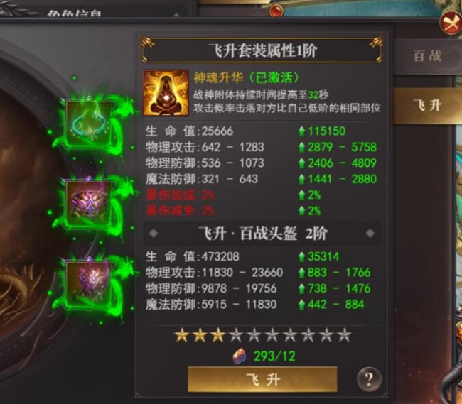 (1)穿戴[皇]阶百战装备才可进行飞升,且穿戴[皇]阶百战装备时飞升属性才会生效