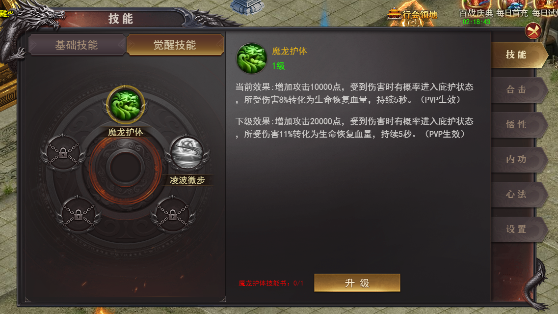 4. 魔龙护体:每级增加攻击属性。受到伤害时,有几率进入庇护状态,所受伤害的百分比转化为生命恢复血量,持续5秒。(PVP有效)
